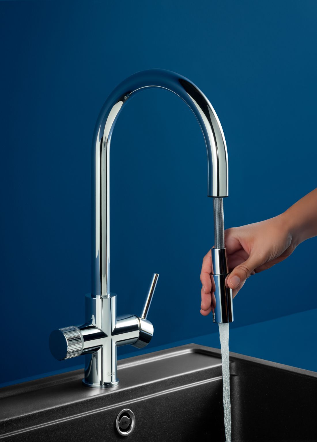 Com um acabamento cromado elegante, esta torneira de filtragem de saída única torna-se numa solução conveniente. Com um design compacto, ajusta-se na perfeição em qualquer cozinha.