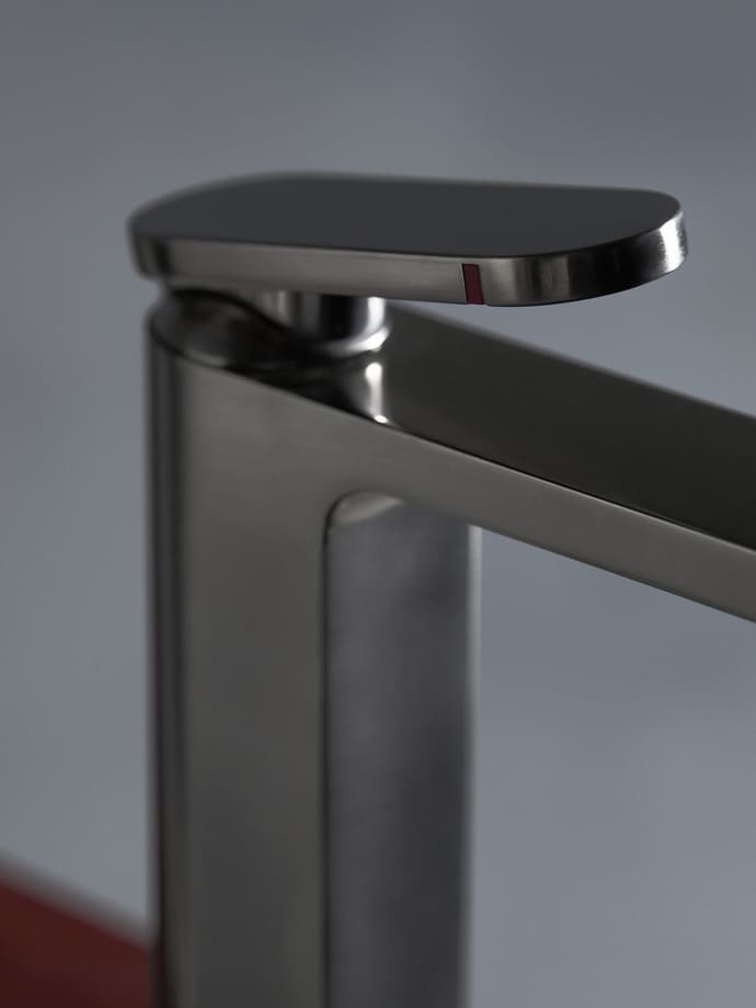 A coleção é definida pela superfície frontal plana e pelo corpo semicircular, um contraste que confere a identidade singular a esta torneira. O manípulo que surge discretamente por cima do corpo da torneira, resulta de um amplo aperfeiçoamento de engenharia que reduz o volume tradicional enquanto mantém o funcionamento perfeito.