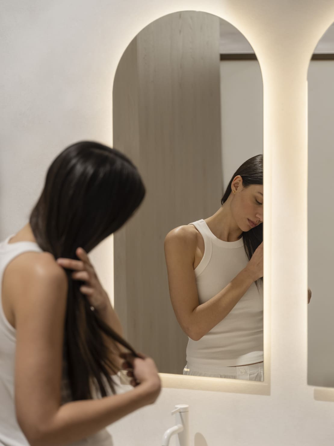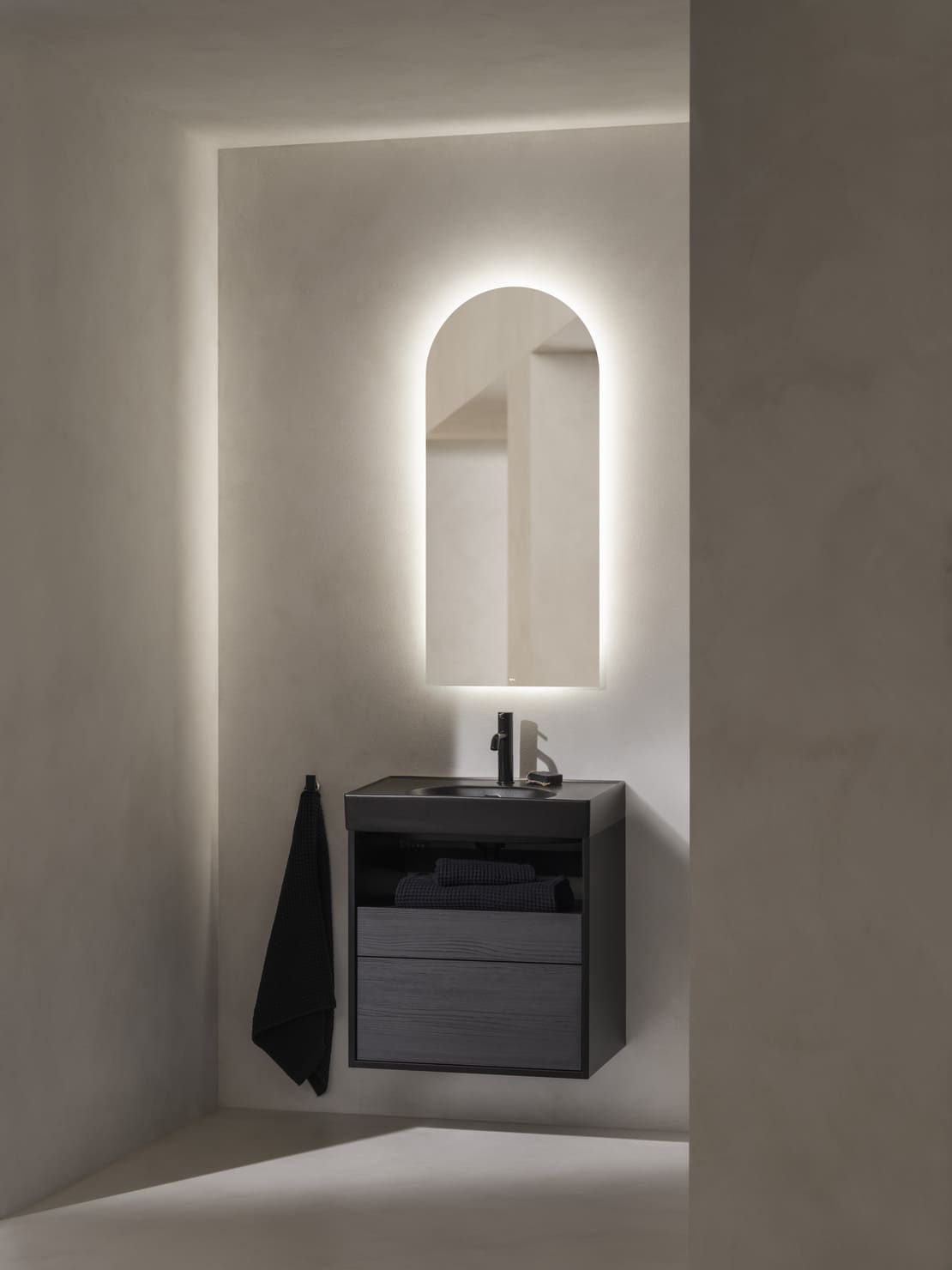 Os espelhos são elementos essenciais no design de uma casa de banho e o complemento perfeito para a coleção Meridian. O espelho Luna Ambient apresenta uma forma arqueada que acompanha de forma harmoniosa o subtil design curvilíneo desta coleção, o que transmite uma sensação de conforto e estilo ao espaço.