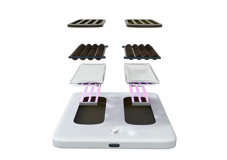 Produto de limpeza inteligente para solas de sapato a ser utilizado em espaços que requerem proteção especial (hospitais, escritórios, escolas, etc.), tendo em conta que o vírus pode sobreviver até cinco dias no calçado. O utilizador fica de pé no espaço indicado, enquanto escovas com bicos são levantadas e pulverizam líquido desinfetante que limpa a sola do sapato. O dispositivo inclui também um sistema de desinfeção e limpeza com luz UV para as escovas.