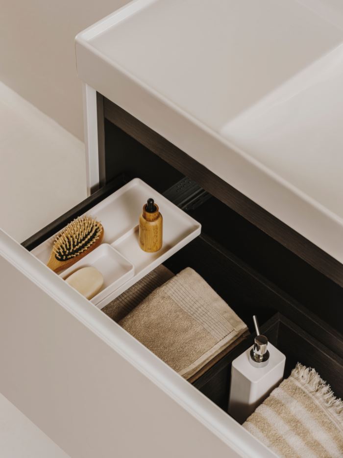 Criámos uma oferta variada para responder facilmente a cada necessidade. Consoante o tamanho, as soluções podem ter uma ou duas gavetas. As gavetas com guias, fecho suave e totalmente extraíveis tornam mais fácil o respetivo manuseamento com puxador integrado. Ao incorporar um organizador na gaveta superior, a coleção Ona oferece uma organização perfeita.