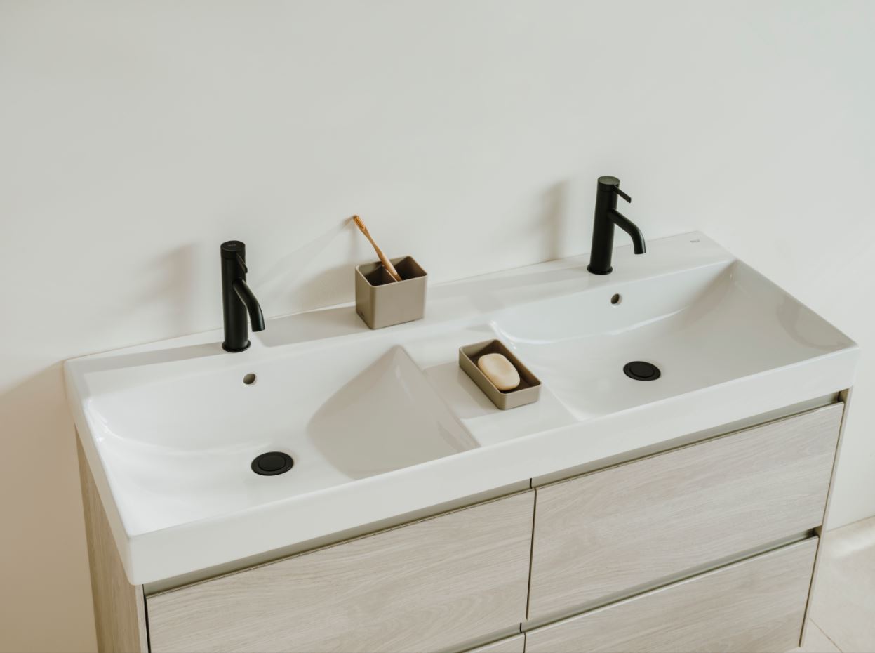 Os lavatórios da coleção Ona estão disponíveis para elegantes móveis com uma ou duas gavetas. Foram incluídas em todas as tipologias colunas e topos de móvel condizentes, sejam simétricos, assimétricos, com lavatório duplo ou lavatório de bancada.