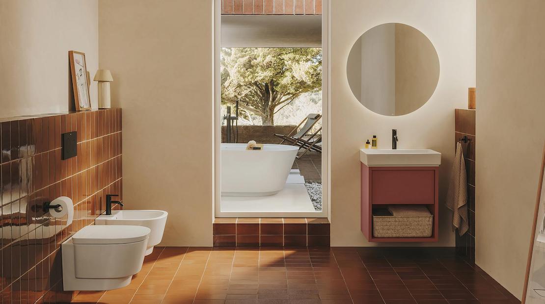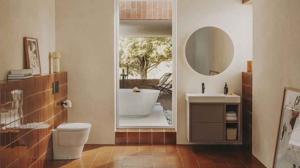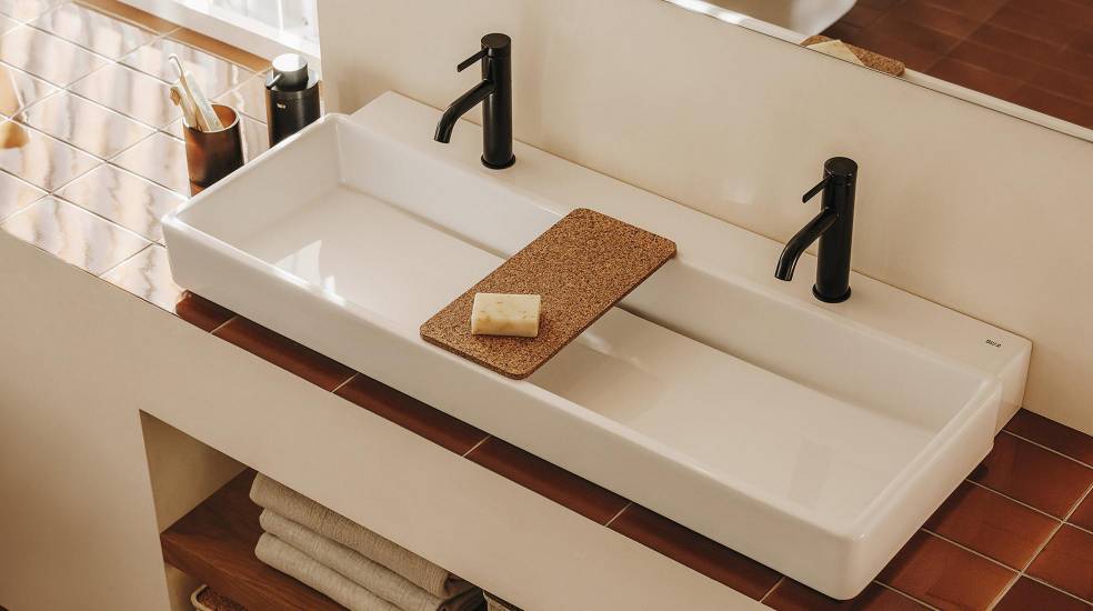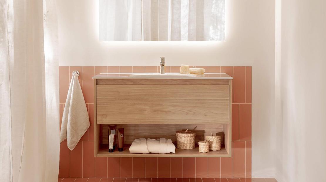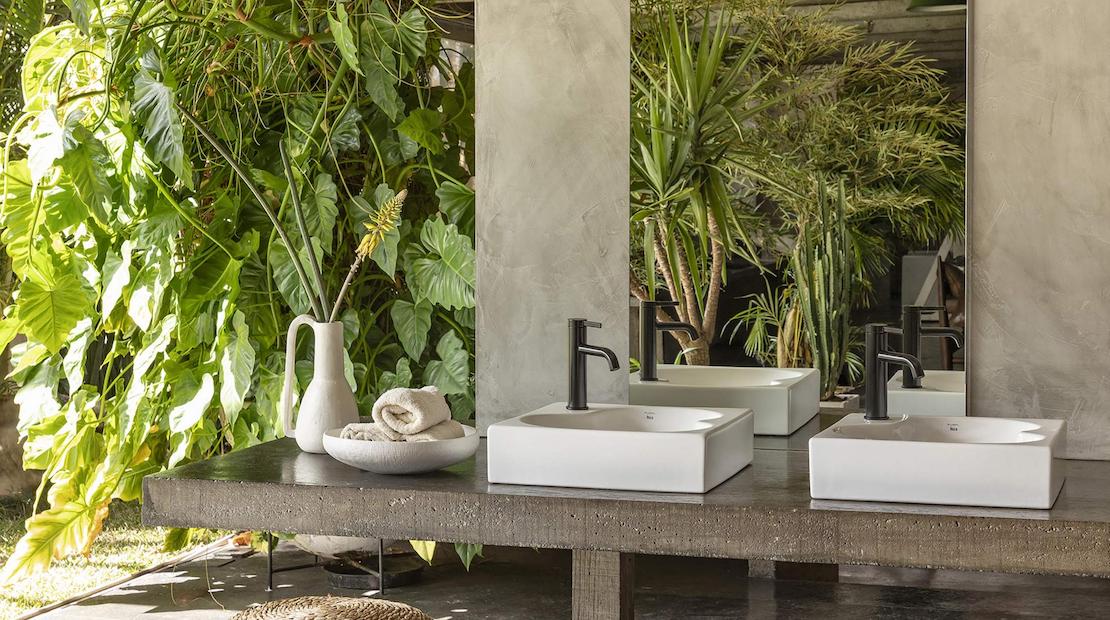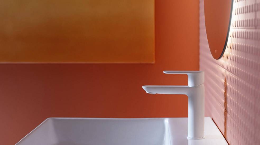 Os móveis de cor terracota claro de Tura e os acessórios de cortiça, madeira e tecido criam espaços acolhedores. A serenidade transmitida através dos designs elegantes e minimalistas da coleção Hotels e a versatilidade de acabamentos da torneira Cala produzem contrastes harmoniosos com as cores frutadas desta tendência tropical.