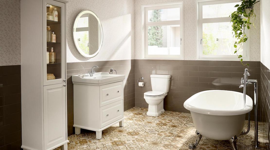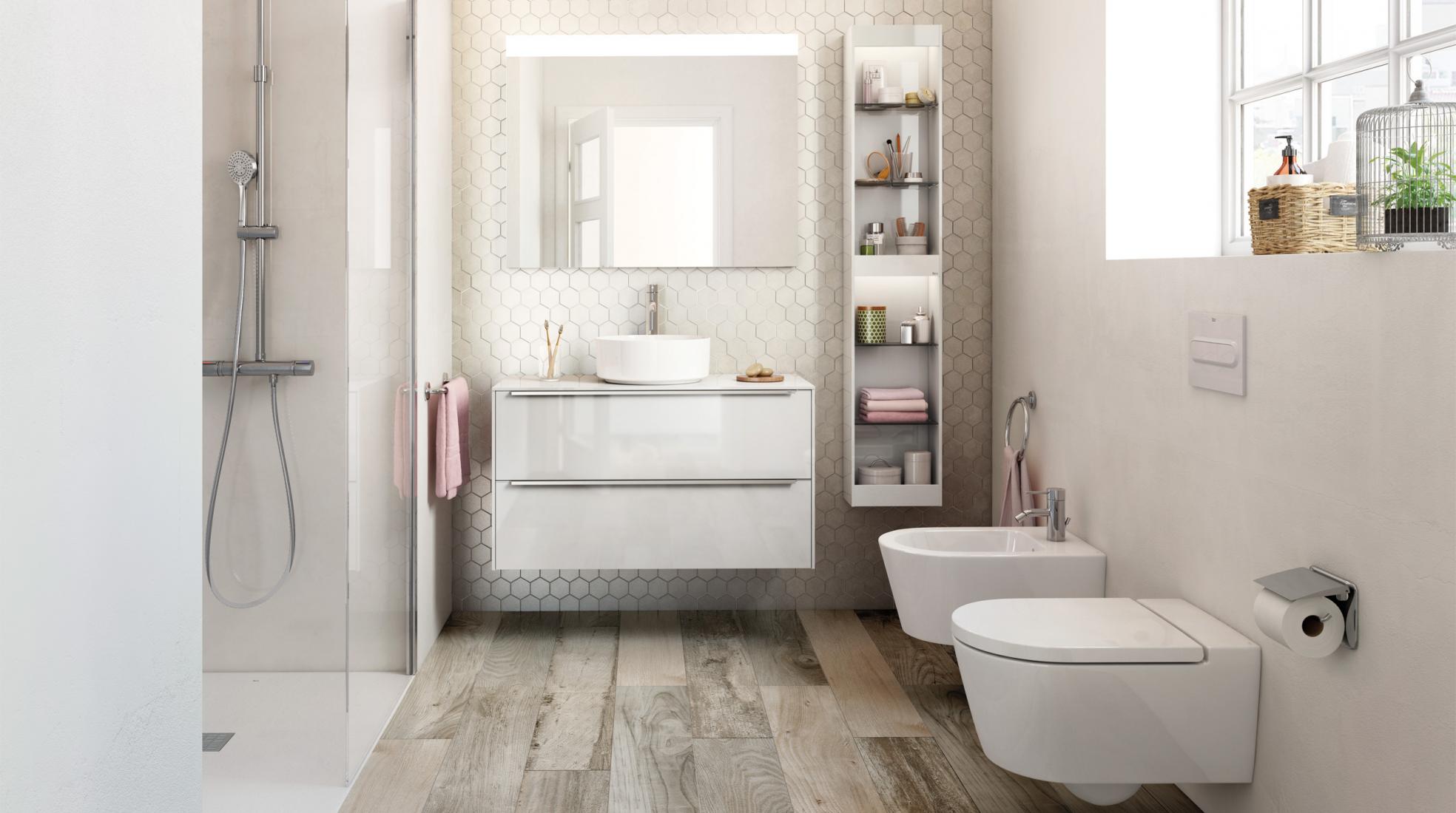 Se o seu espaço de banho é pequeno, existem módulos de colunas que pode instalar por cima da sanita ou do bidé, e que lhe permitem, assim, aproveitar ao máximo cada centímetro. Use estes móveis para espaços de banho compactos para armazenar produtos de higiene pessoal que ocupam menos espaço, como, por exemplo, um kit de primeiros socorros.