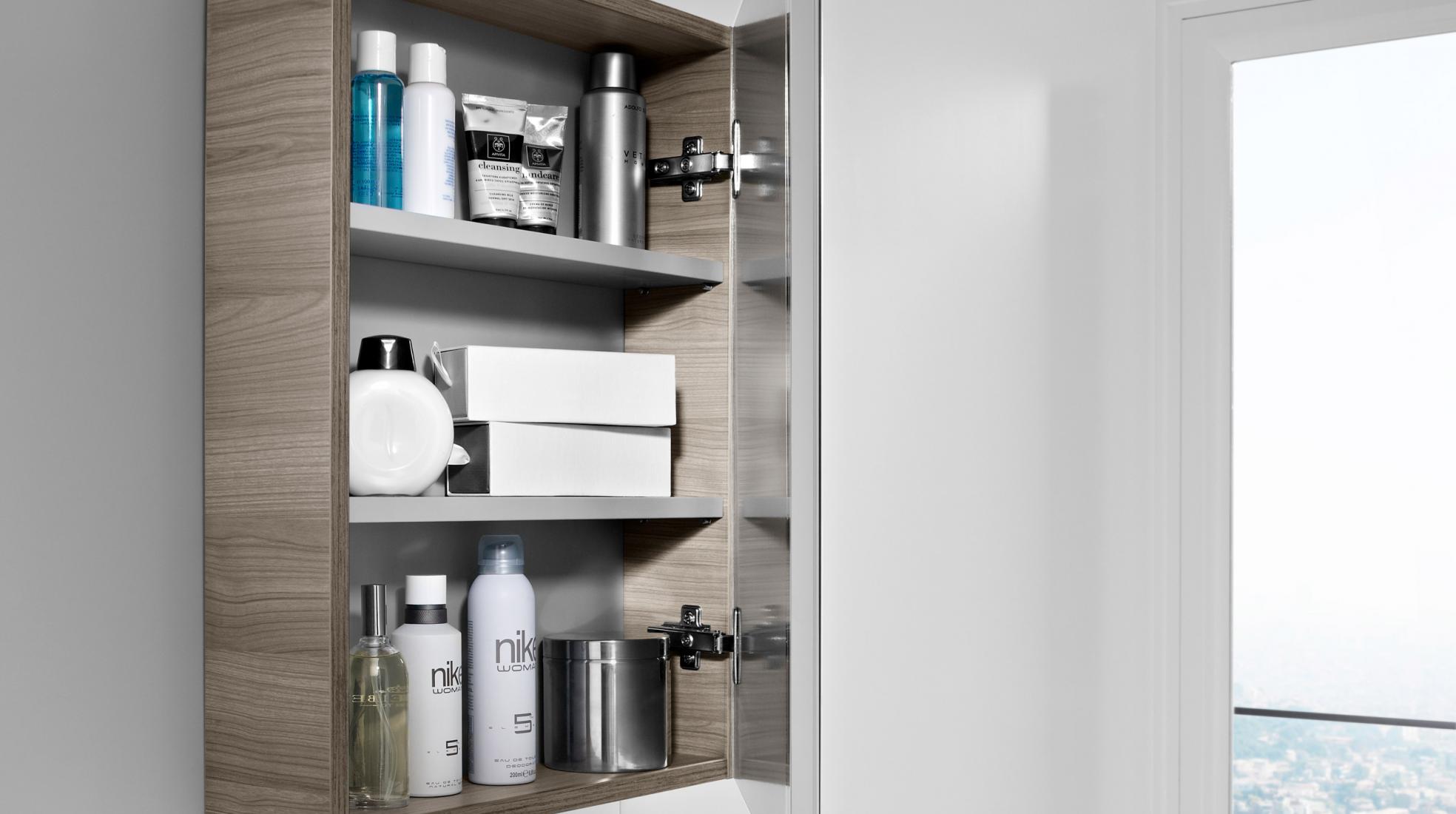Em espaços de banho mais pequenos, como é o caso dos espaços de banho sociais, a originalidade dos armários espelhados permite-lhe desfrutar dos módulos complementares para espaços de banho. Use-os para ter os seus produtos de higiene — sabonetes, escovas de dentes e dentífrico, por exemplo — sempre à mão.