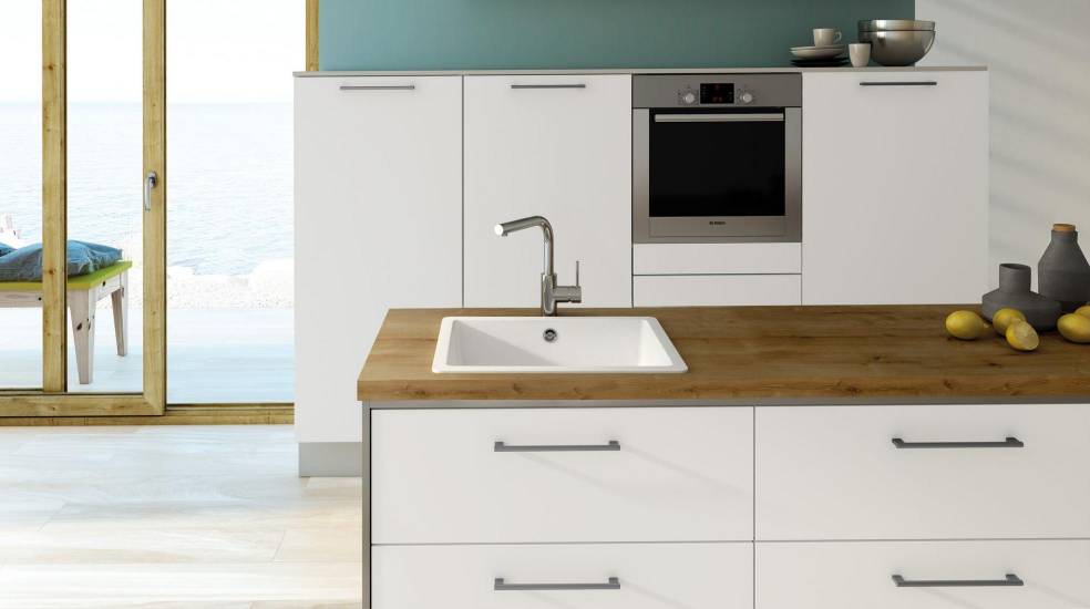 Os lava-louças de Quarzex® estão disponíveis em vários acabamentos coloridos — Branco, Negro e Cinzento — e mantêm-se em perfeito estado após contacto com produtos químicos e luz ultravioleta.
