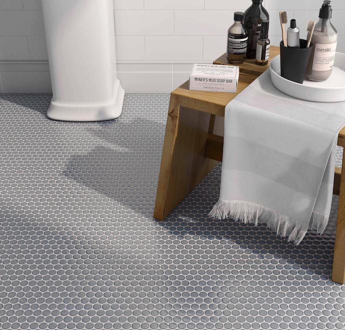 Comecemos pelos mosaicos Penny Round da Roca, que recuperam a história dos tradicionais mosaicos cerâmicos Penny, de 32×29 mm, com um acabamento brilhante. Unindo múltiplos círculos como os que costumava haver nas cozinhas, nos halls e nos espaços de banho vintage coloridos de há muitos anos, existem hoje em três tons neutros: Blanco, Negro e Gris. Não hesite em optar por esta proposta, se o que procura é minimalismo ou se procura contraste nos mais diversos espaços. Será especialmente do seu agrado o efeito deste mosaico em espaços de banho e cozinhas com um estilo Mid Century, já que, pela sua geometria simples, o Penny adequa-se na perfeição à conceção urbana e modernista dos espaços com este estilo.