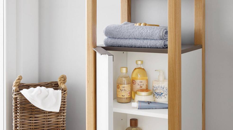A coleção Natura permite-lhe guardar ainda mais elementos à vista num móvel para espaços de banho auxiliar: uma coluna que combina três prateleiras brancas à vista, reguláveis, com um compartimento fechado.