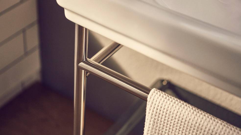 Numa reinterpretação dos mais carismáticos lavatórios vintage, a evocadora coleção Carmen aposta numa estrutura metalizada, cheia de reminiscências. Elaborada em aço inoxidável, esta estrutura para lavatório sobre a bancada é fixada à parede, deixando repousar à frente os seus dois únicos pés, com sofisticados traços arredondados.