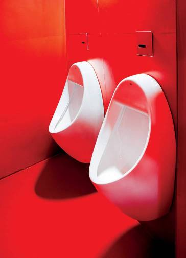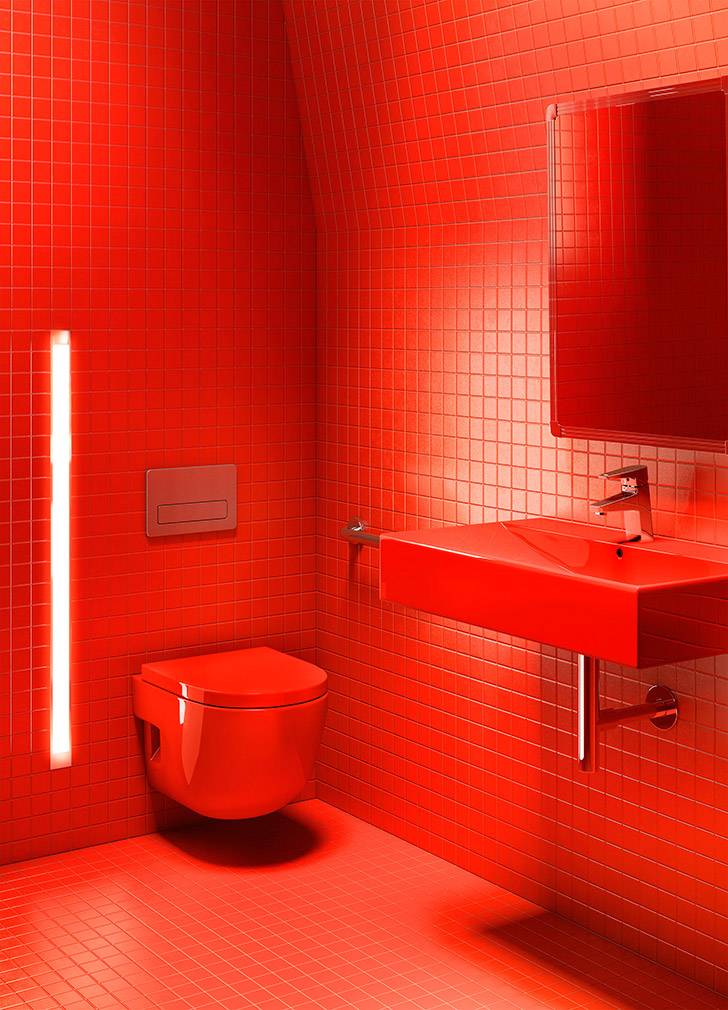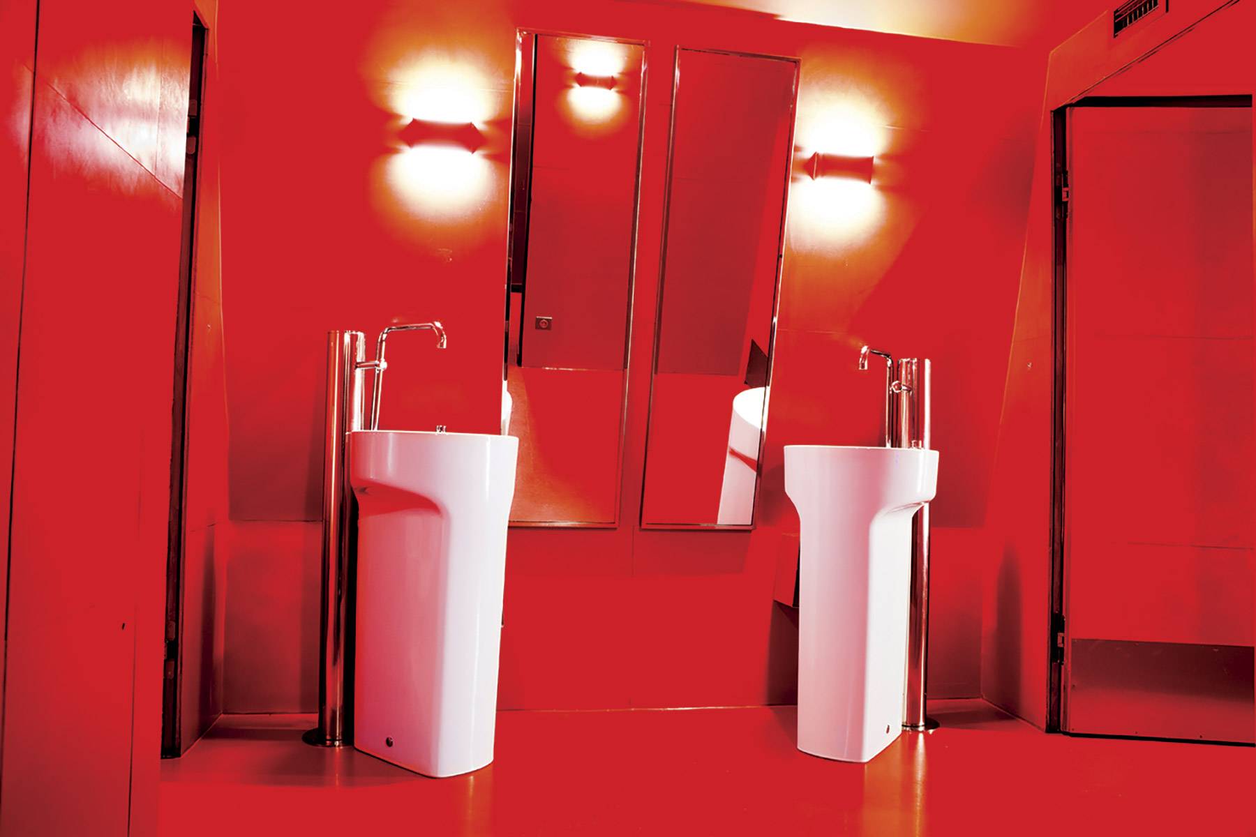 Concebido para uso privado, o pavilhão Eiffel, no primeiro andar, conta com uma sala de conferências com capacidade para 300 pessoas e foi o primeiro espaço da torre a ser equipado com a gama completa de produtos Roca – das porcelanas, às torneiras, passando pelos sistemas de instalação e placas de acionamento. Numa área com paredes pintadas a vermelho “veneziano” brilhante, o branco dos urinóis, das sanitas e dos lavatórios Roca contrasta com esse tom forte, outrora o original em toda a torre. Inspirado nesta informação, para muitos visitantes desconhecida, o arquiteto responsável pelo projeto, Alain Moatti, optou pelo lavatório Amberes e pela sanita Meridian na sua versão suspensa para criar contraste entre linhas curvas e direitas, prestando a sua homenagem pessoal num diálogo entre o vermelho e o branco.