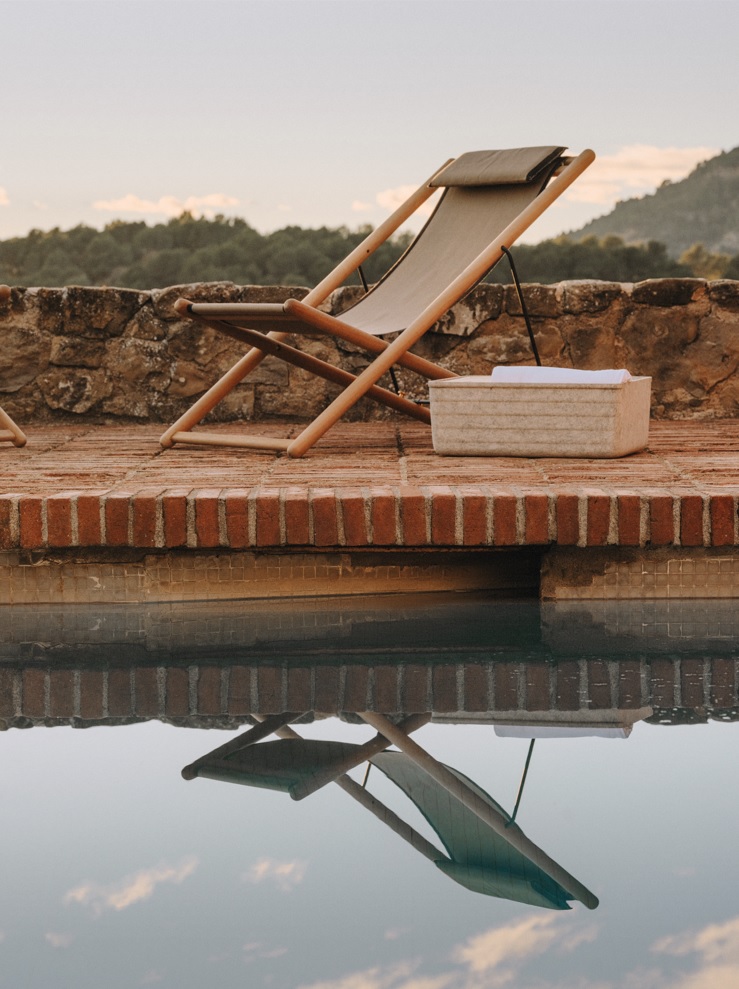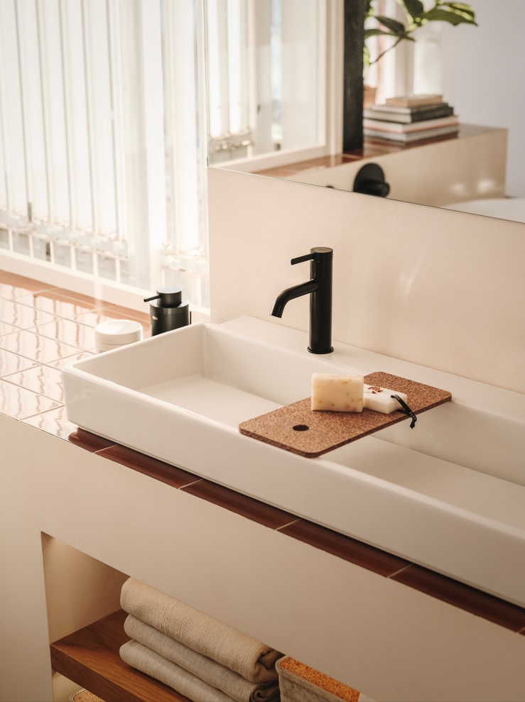 Uma pequena almofada e uma elegante bandeja em madeira, ambas para banheira, completam a coleção. O original apoio de cabeça para banheira feito à mão é produzido com tecido reciclado de secagem rápida e inclui um contrapeso em madeira para permitir ajustar facilmente a altura.